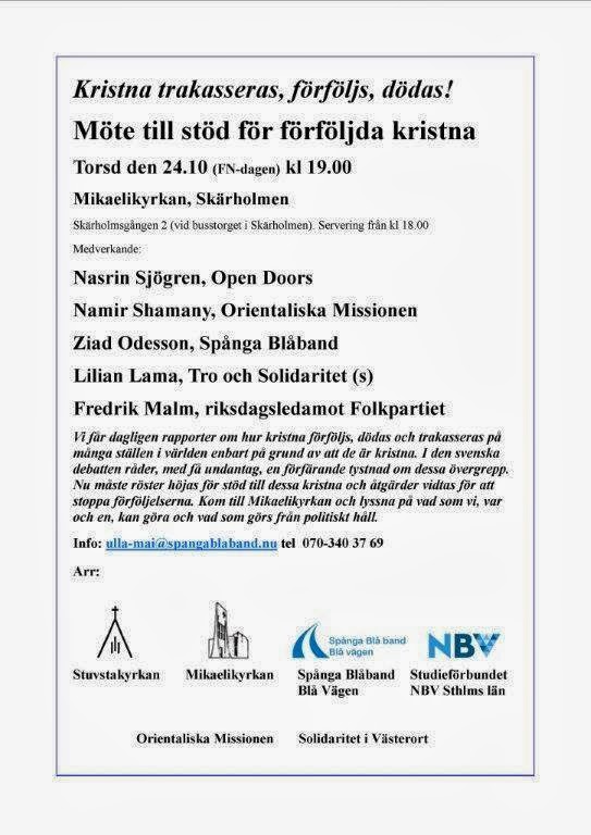 Jag deltar på ett stödmöte för utsatta kristna i Mellanöstern, nu på torsdag i Skärholmen. Se inbjudan nedan.